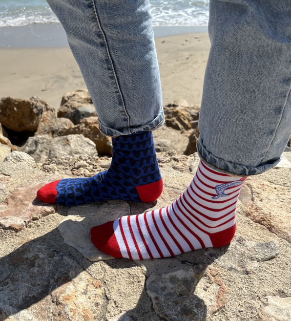 Para la promoción del libro hice unos calcetines coordinados, uno con las escamas de la cola de sirena, otro con las rayas marineras de la camiseta de la portada.