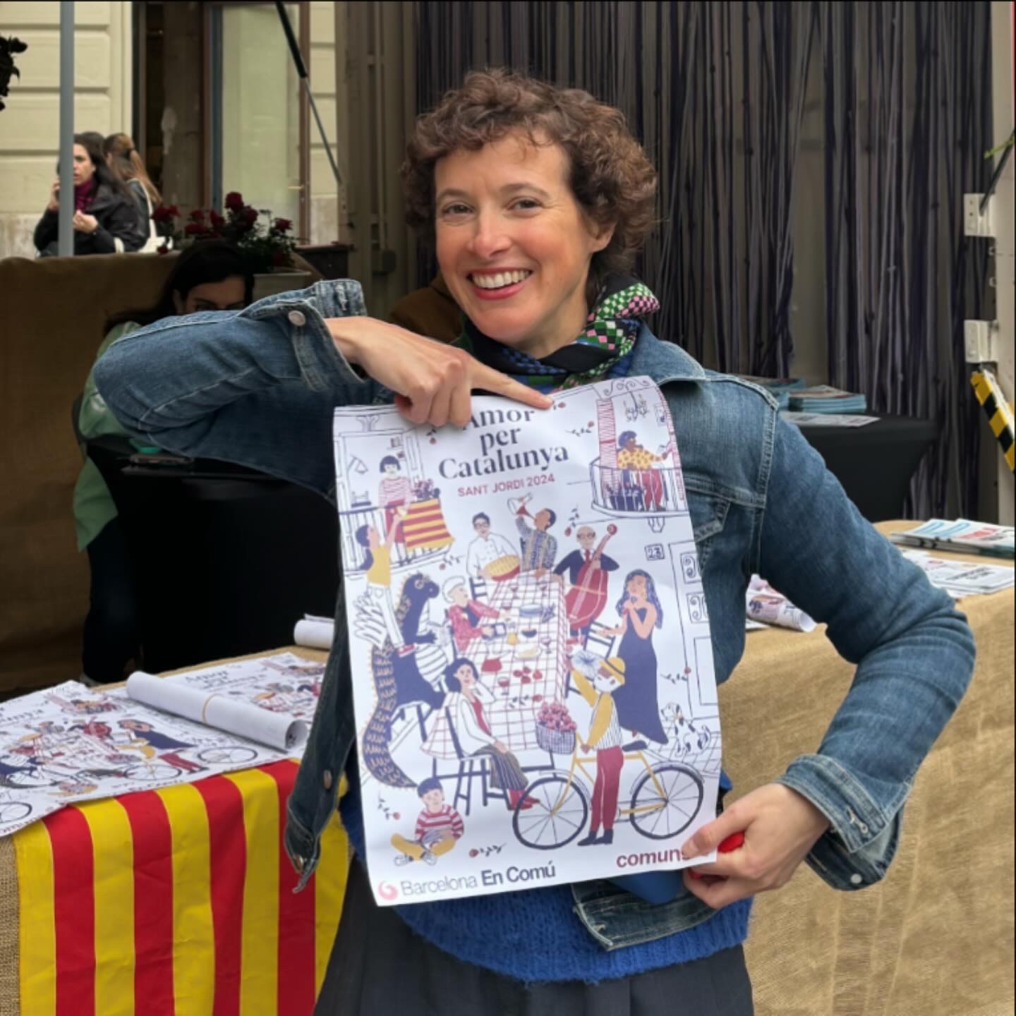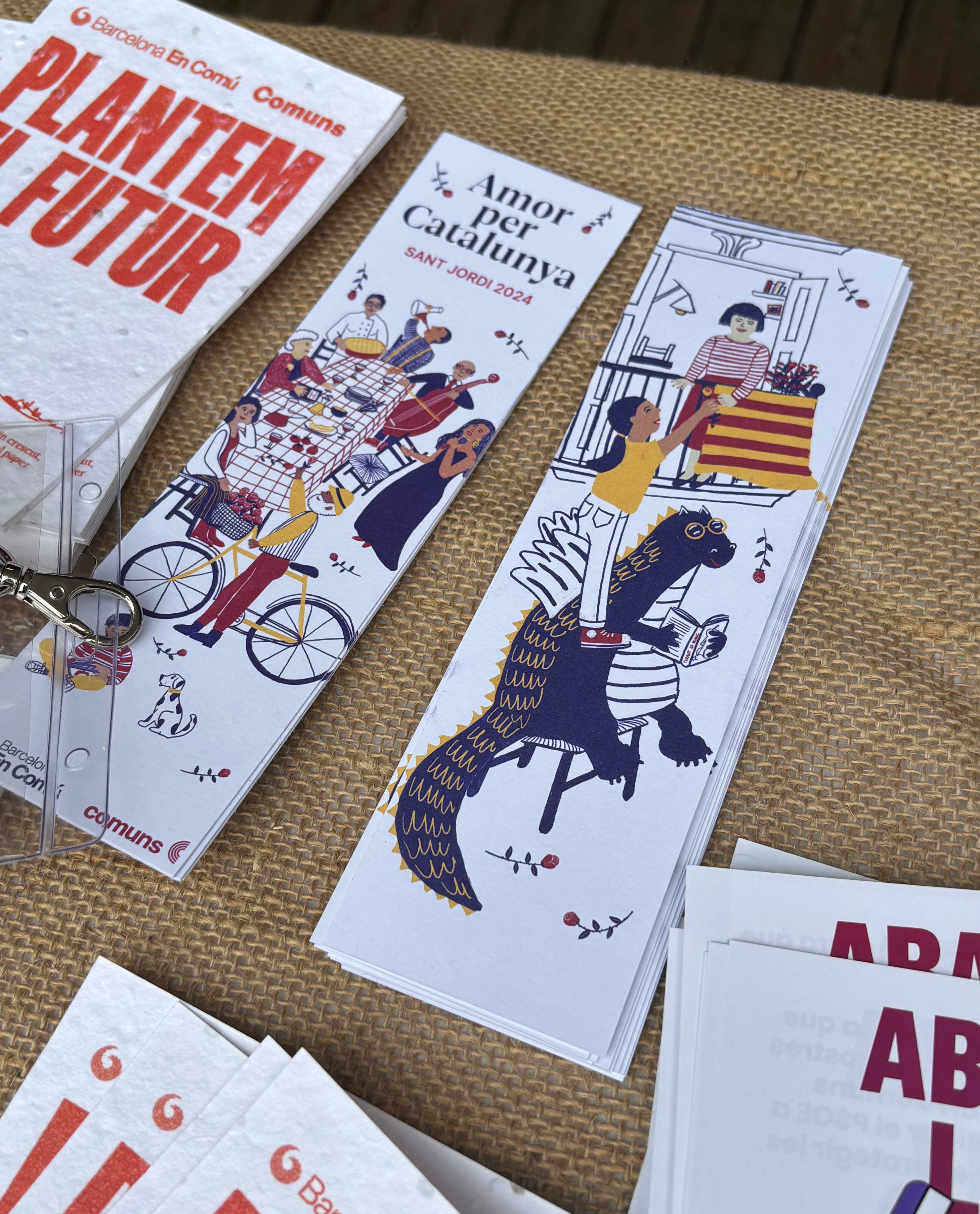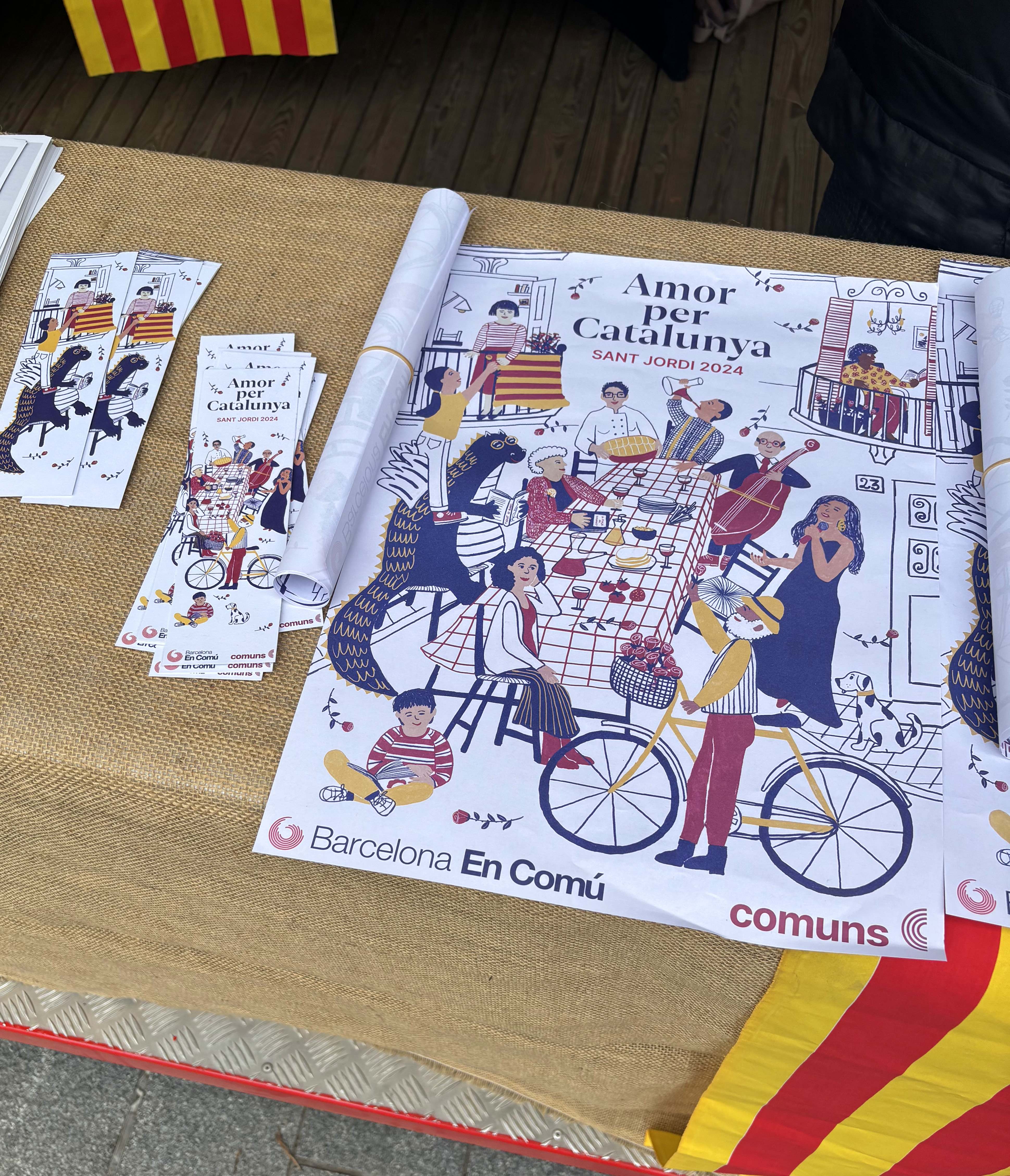 En el Sant Jordi de 2024 tuve el placer de ilustrar el cartel de Barcelona en Comú y Som Comuns. El mensaje que querían transmitir era el amor por Cataluña, su cultura y su lengua. Desde el principio tuve muy claro que quería representar una comida popular con personajes que comparten cultura y rosas alrededor de la mesa; algunos evocan personajes famosos del arte, la cultura y la gastronomía, ¿reconocéis a alguien? Y no falta el dragón leyendo Tirant lo Blanc.