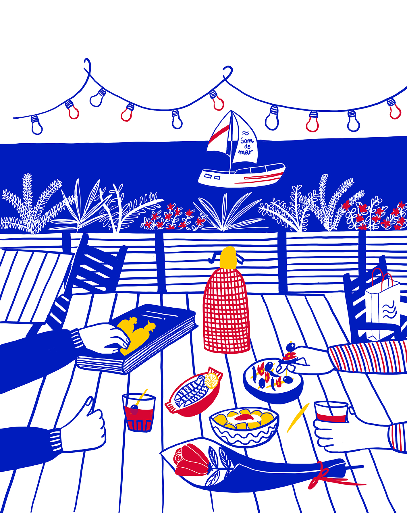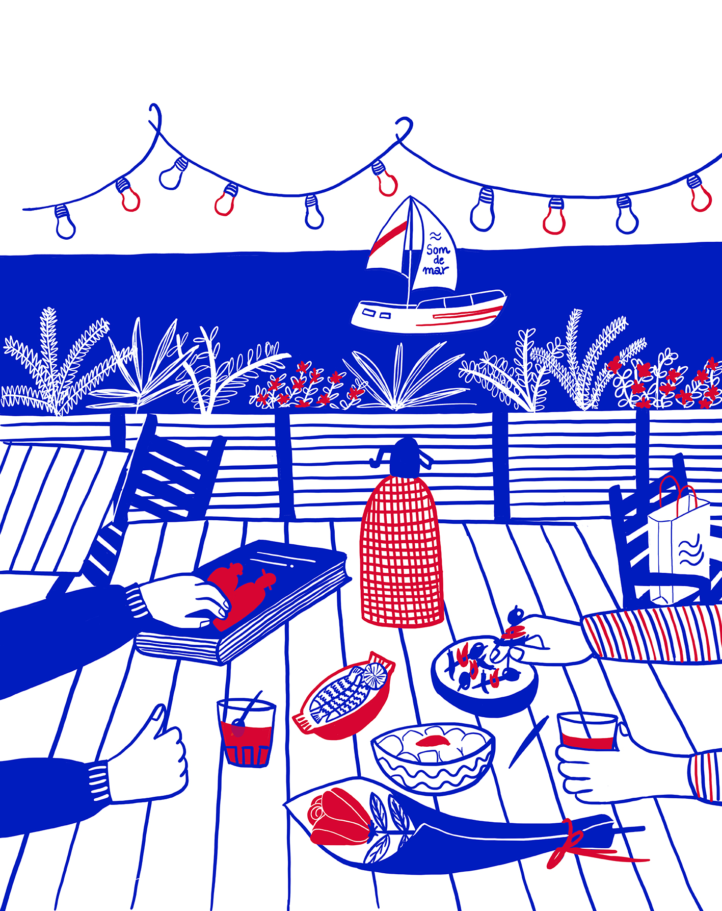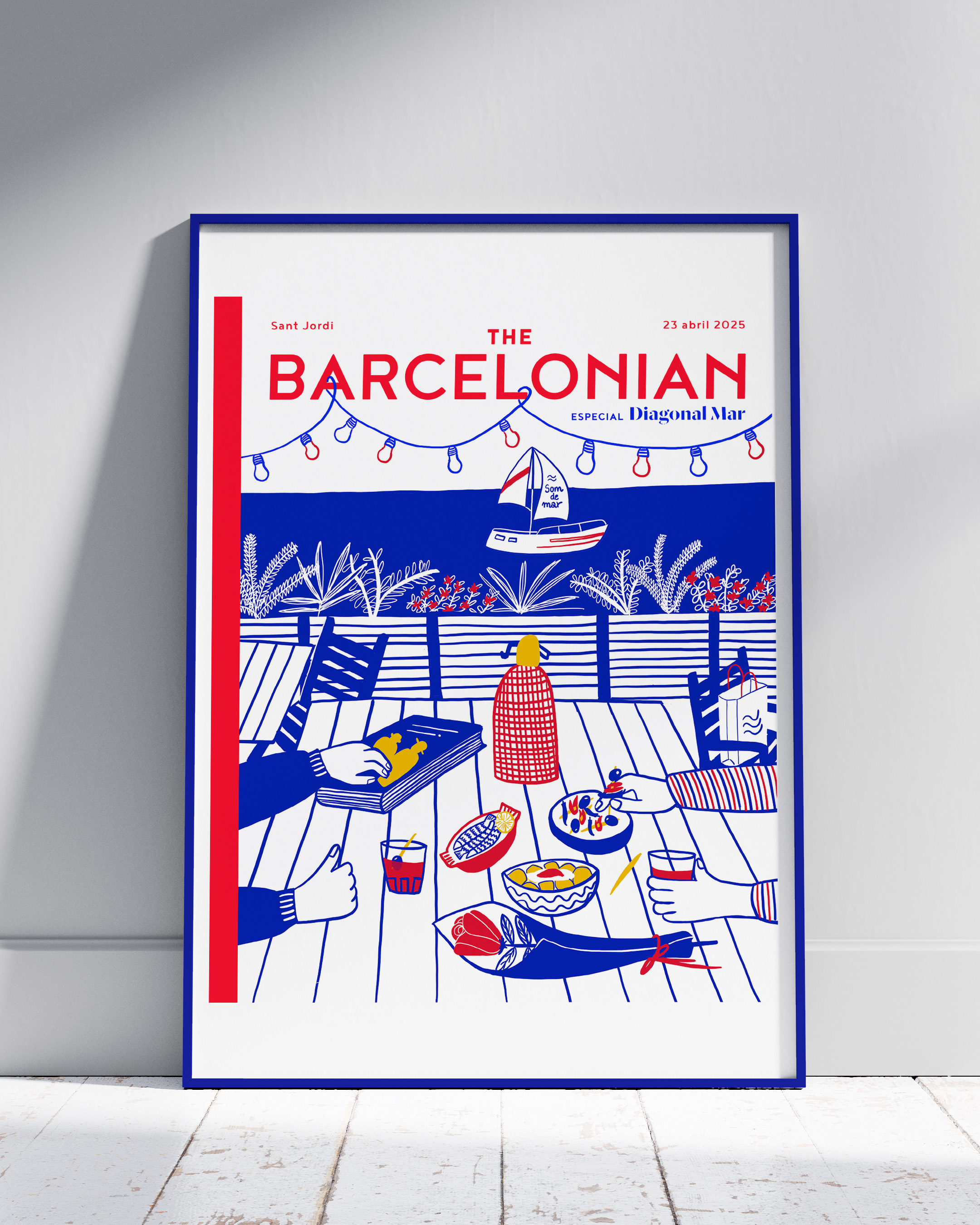 Ilustración de The Barcelonian especial Diagonal Mar. El centro comercial nos encargó esta ilustración para regalar a sus clientes el día de Sant Jordi de 2025. En ella querían reflejar el día con los típicos libro y rosa y un vermut en las terrazas del centro. Se hicieron dos versiones, una en tres colores y otra bicolor.